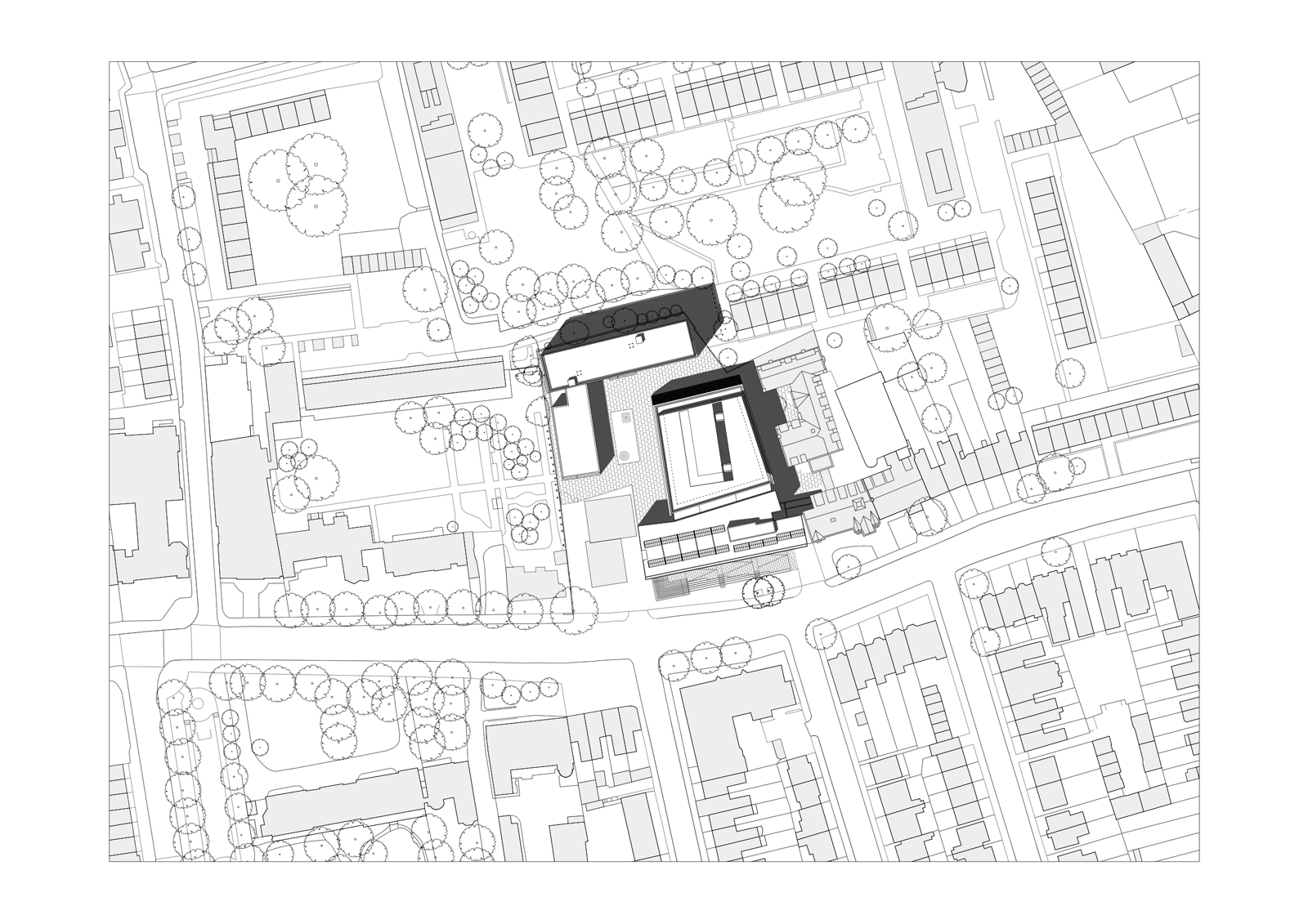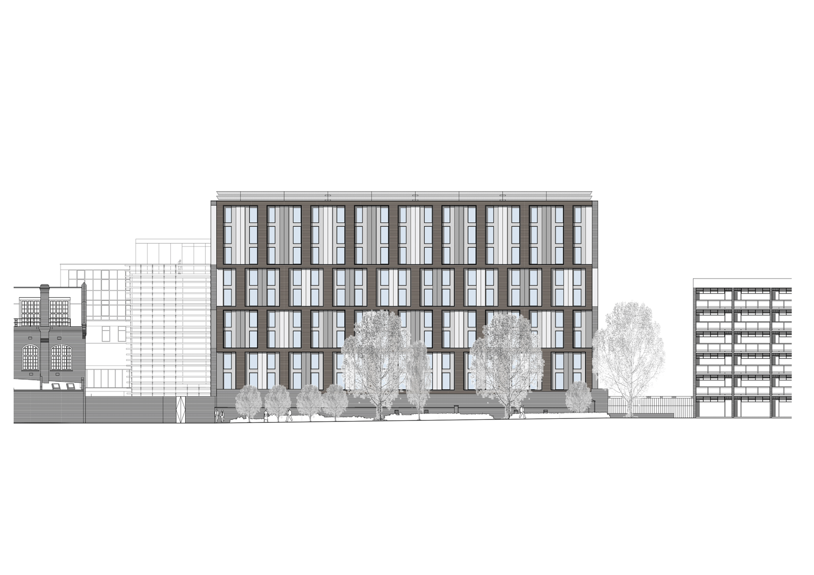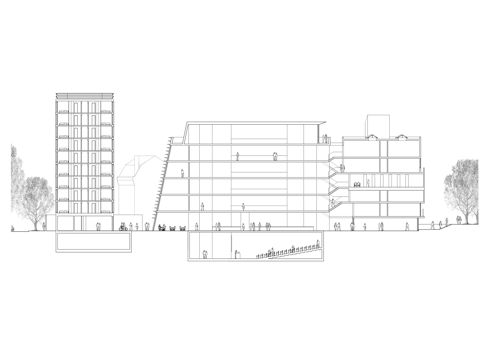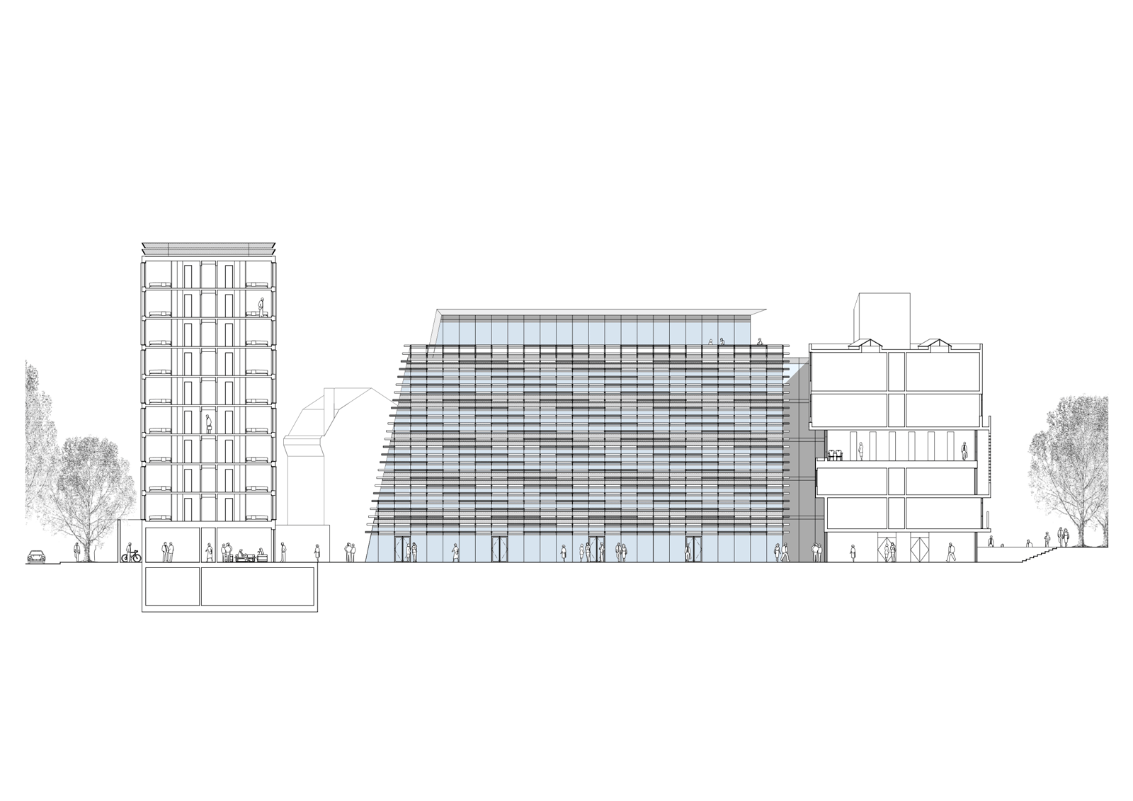 The scheme under construction involves new student accommodation and a studio building formed over six floors with louver cladding for good daylight. A new entrance is proposed by ramp to the lower ground floor and campus courtyard.