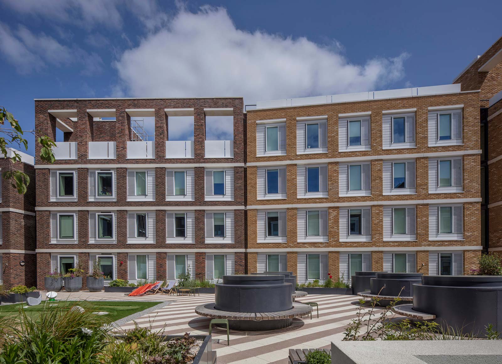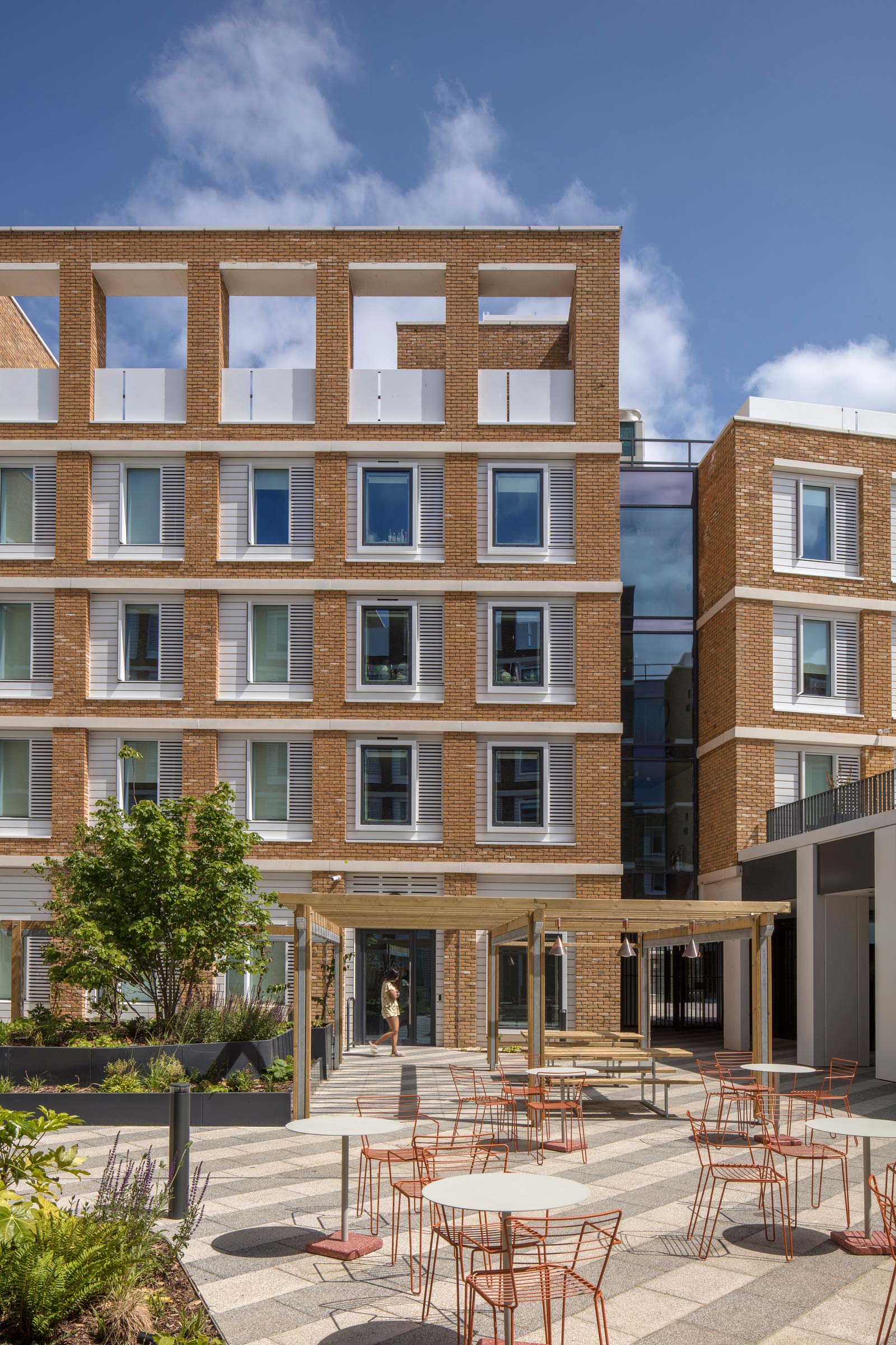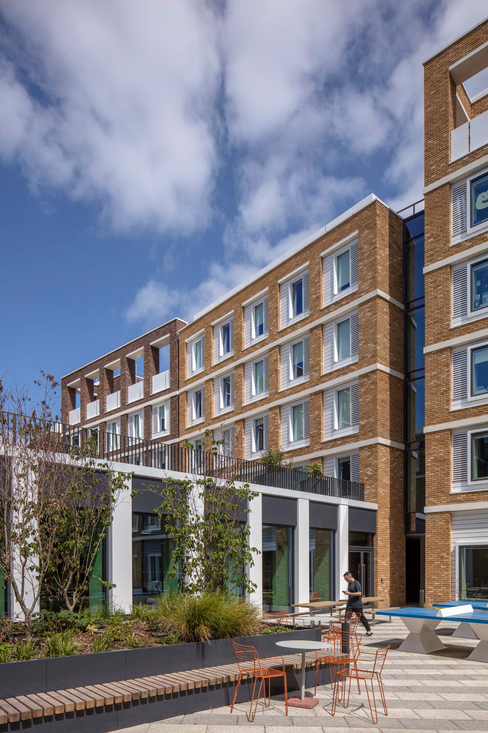The development provides 774 student bedspaces with communal amenities, an affordable housing building, a new public street lined with retail, and extensive external spaces. The buildings range from 4 to 10 storeys in height and are constructed in a palette of brick, precast concrete and aluminium panels.