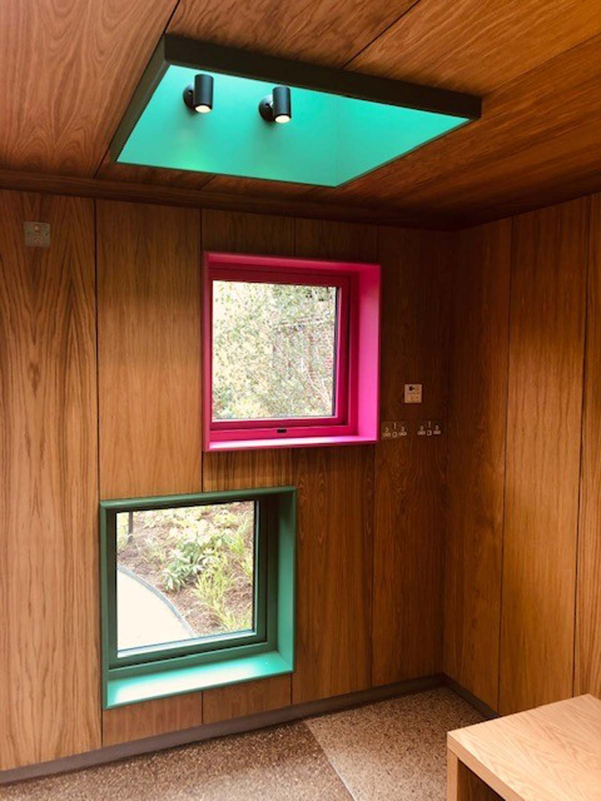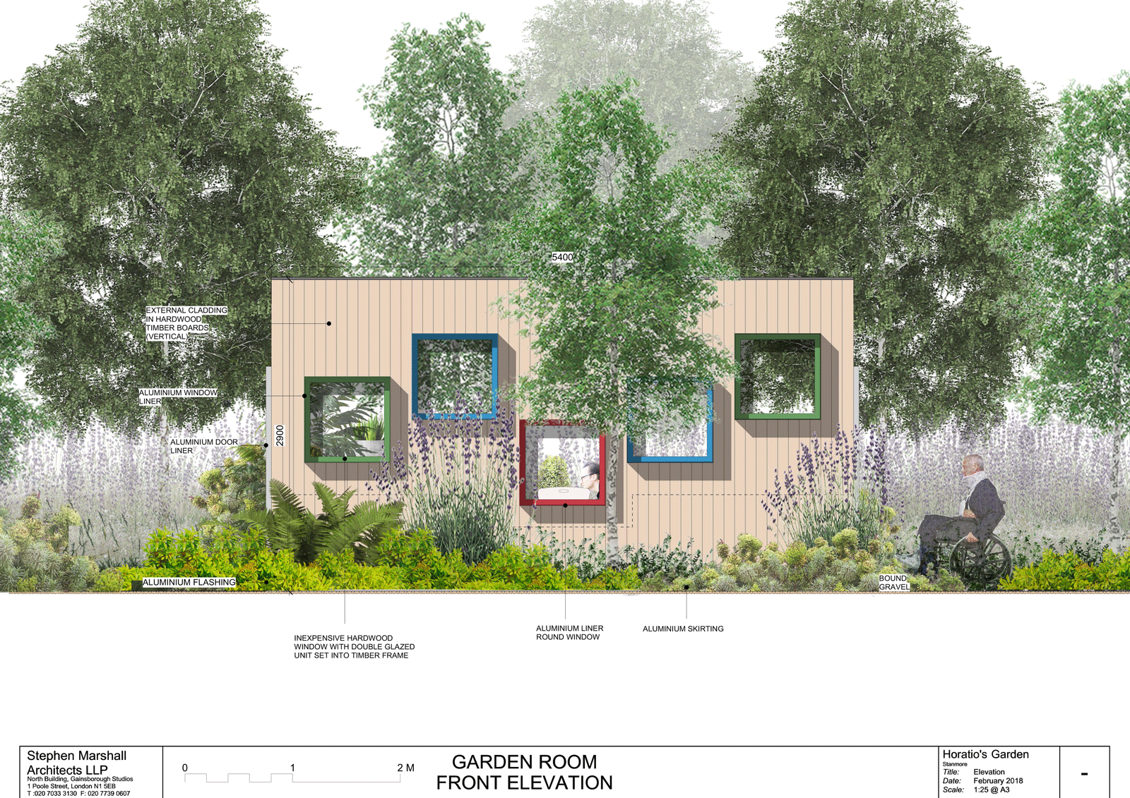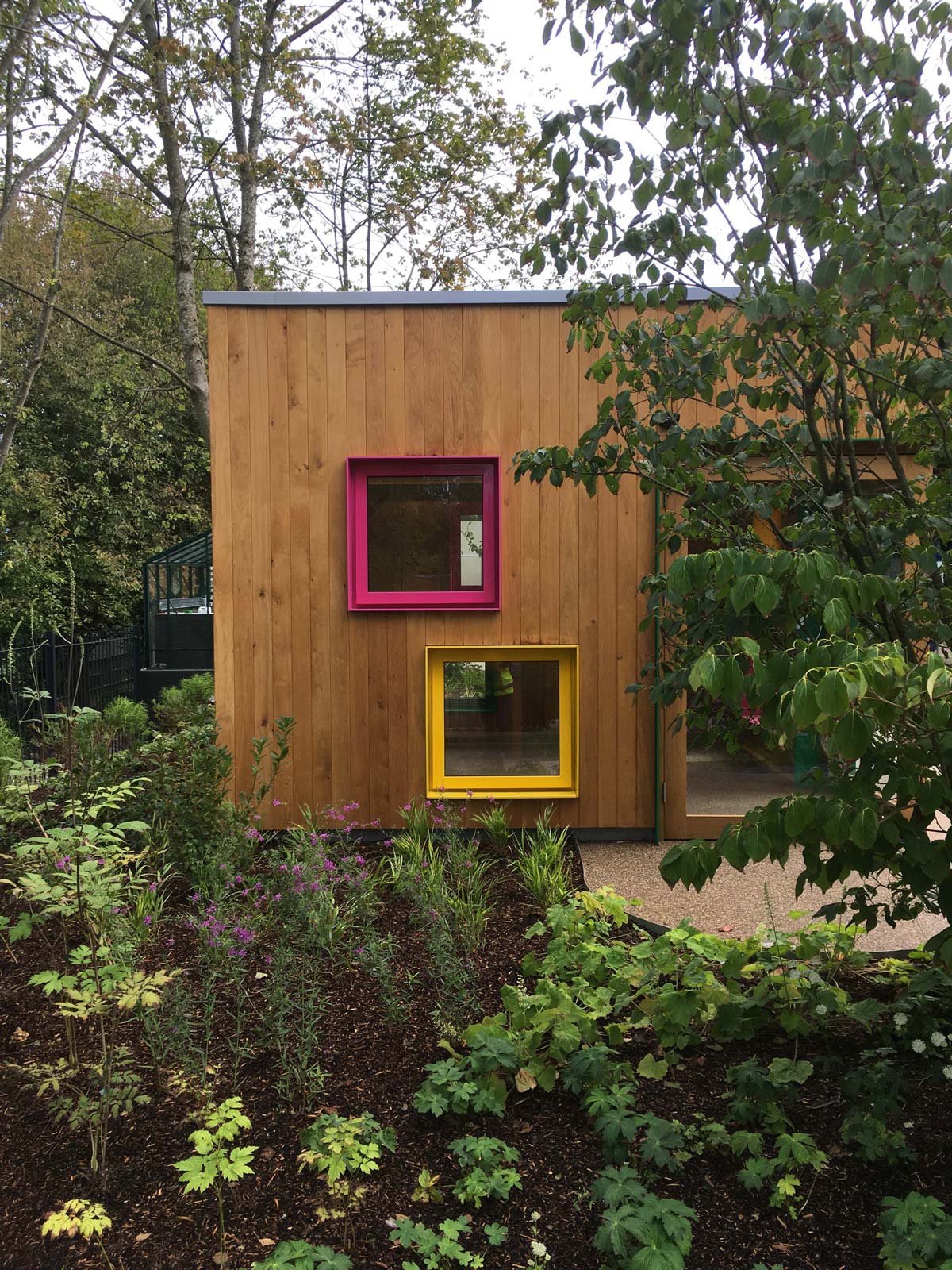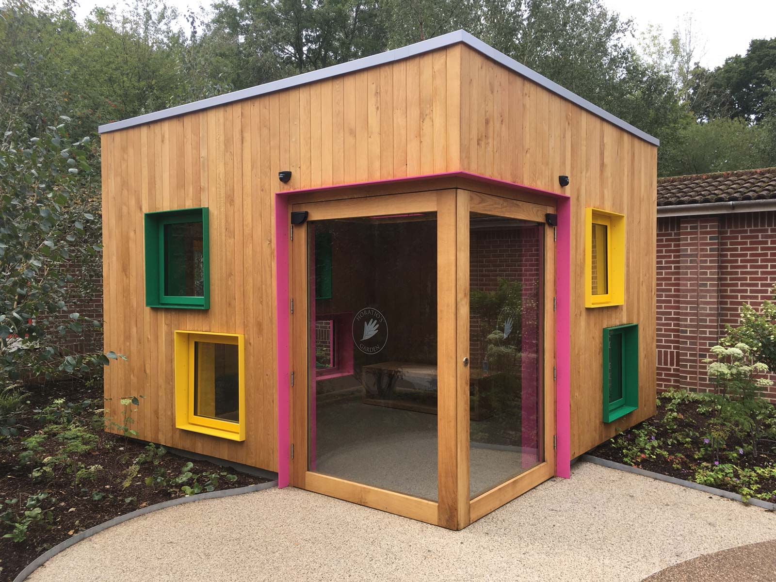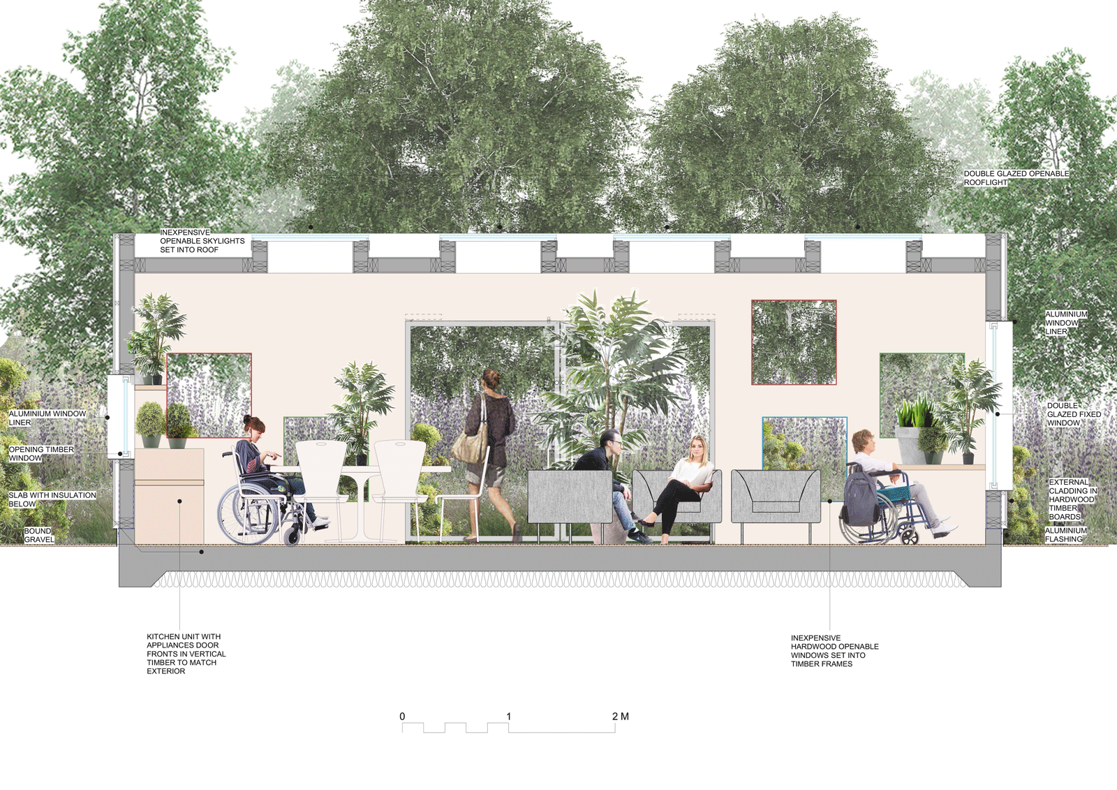 The garden room is a communal space for meeting and indoor gardening, again the windows are located at specific surrounding positions. The gardeners office has a series of coloured louvres for privacy and shape.