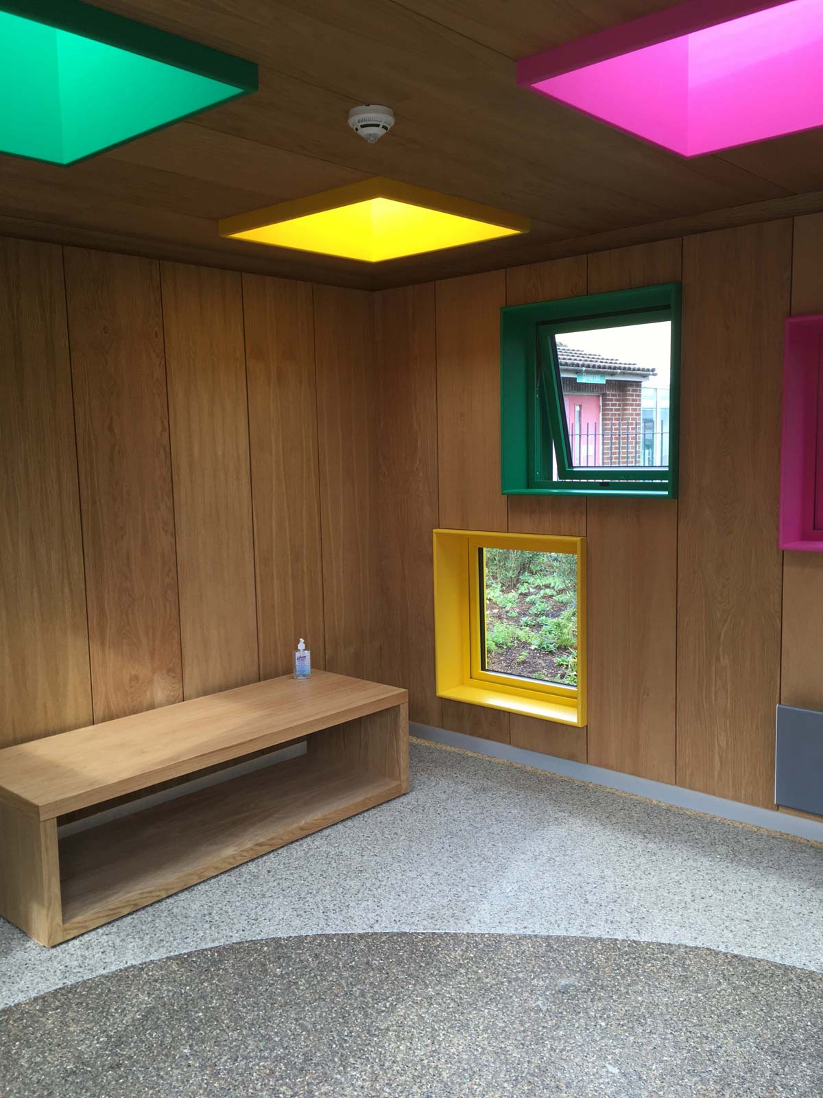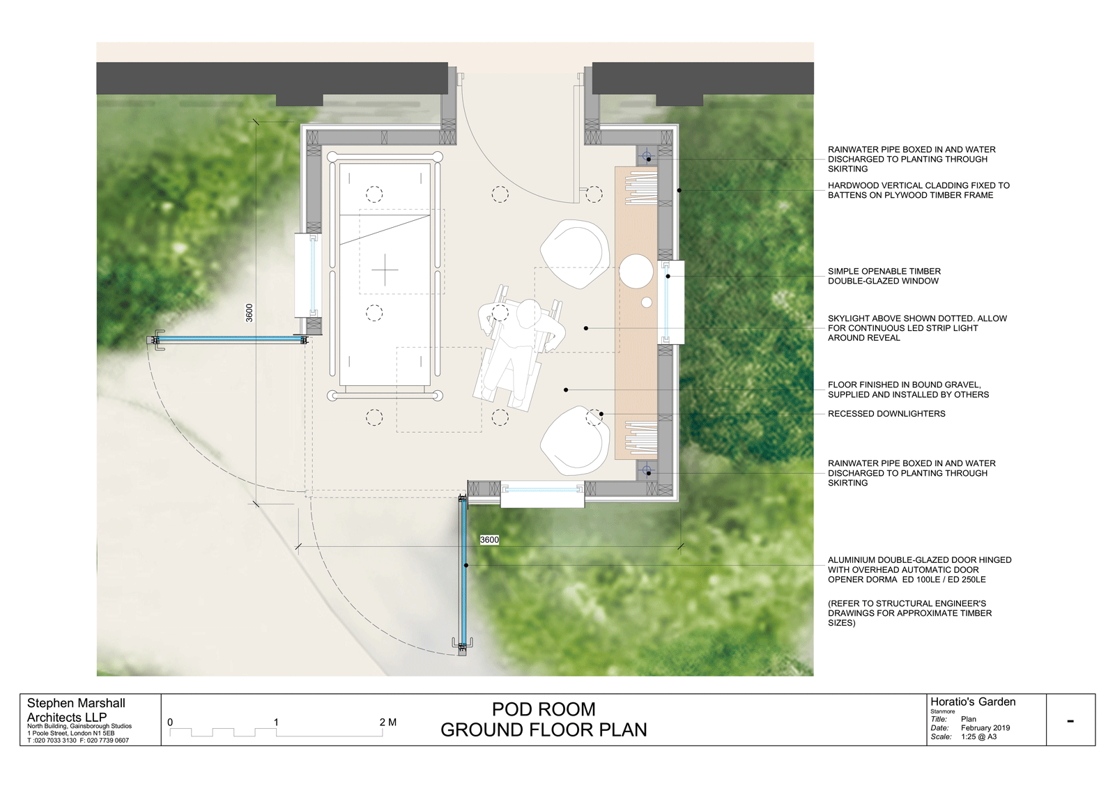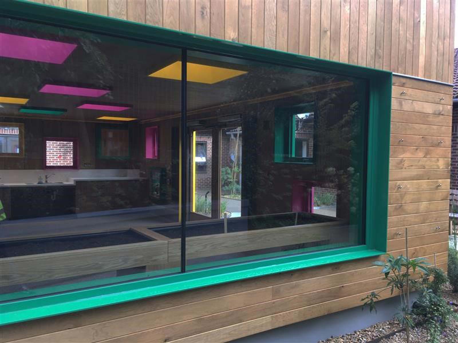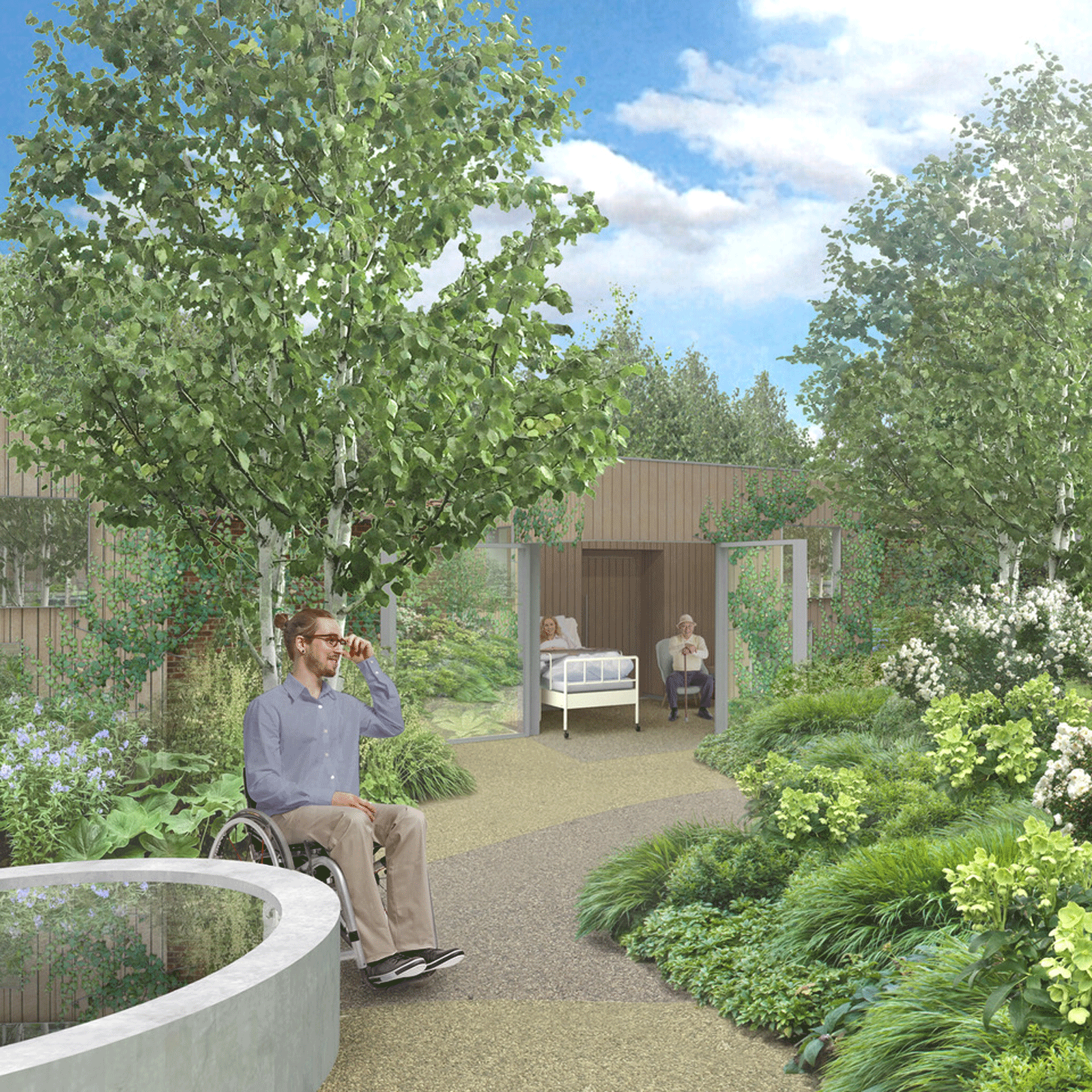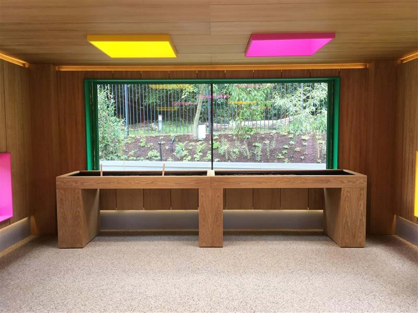There are two types of space, The garden cubes and the garden room. Garden cubes are designed to allow patients with limited movement maximum views of the garden planting and water as well as the sky. The spaces are thought of as garden sheds with carefully positioned windows as well as opening out to the garden with large corner doors.