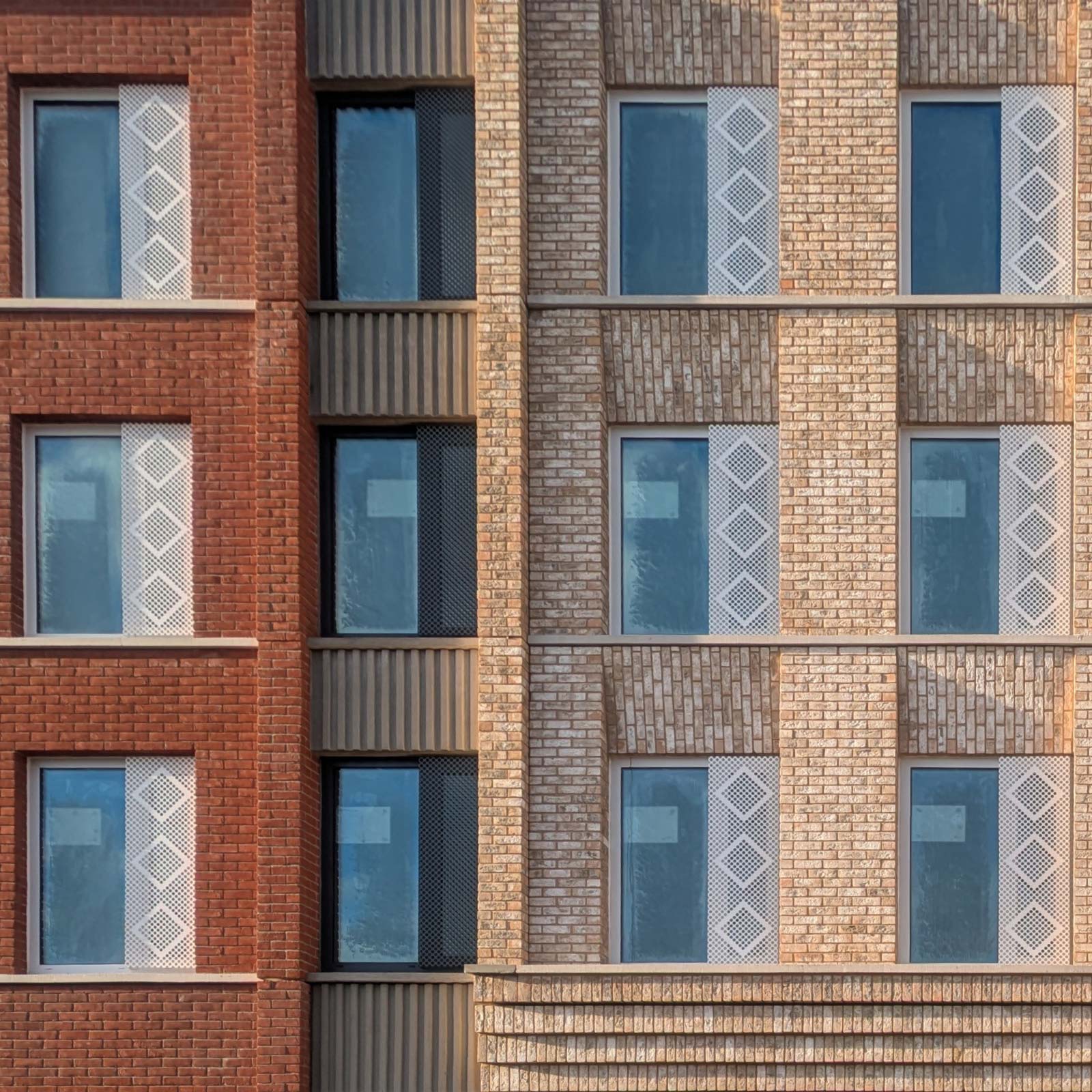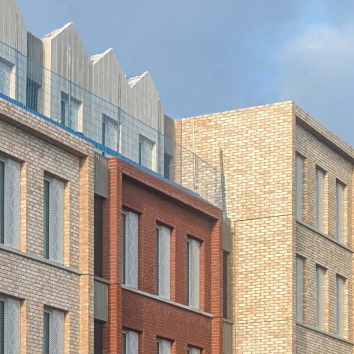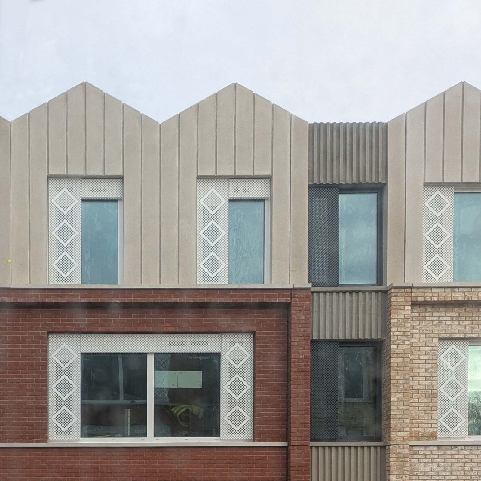 The project is formed as a series of interlinked ‘townhouses’ which reflect the urban grain of the surrounding context. In keeping with the local context the buildings are constructed using red / beige brickwork, white windows and precast stone sills. Off site fabrication of the external wall has allowed the brickwork detailing to be factory finished to a high standard.