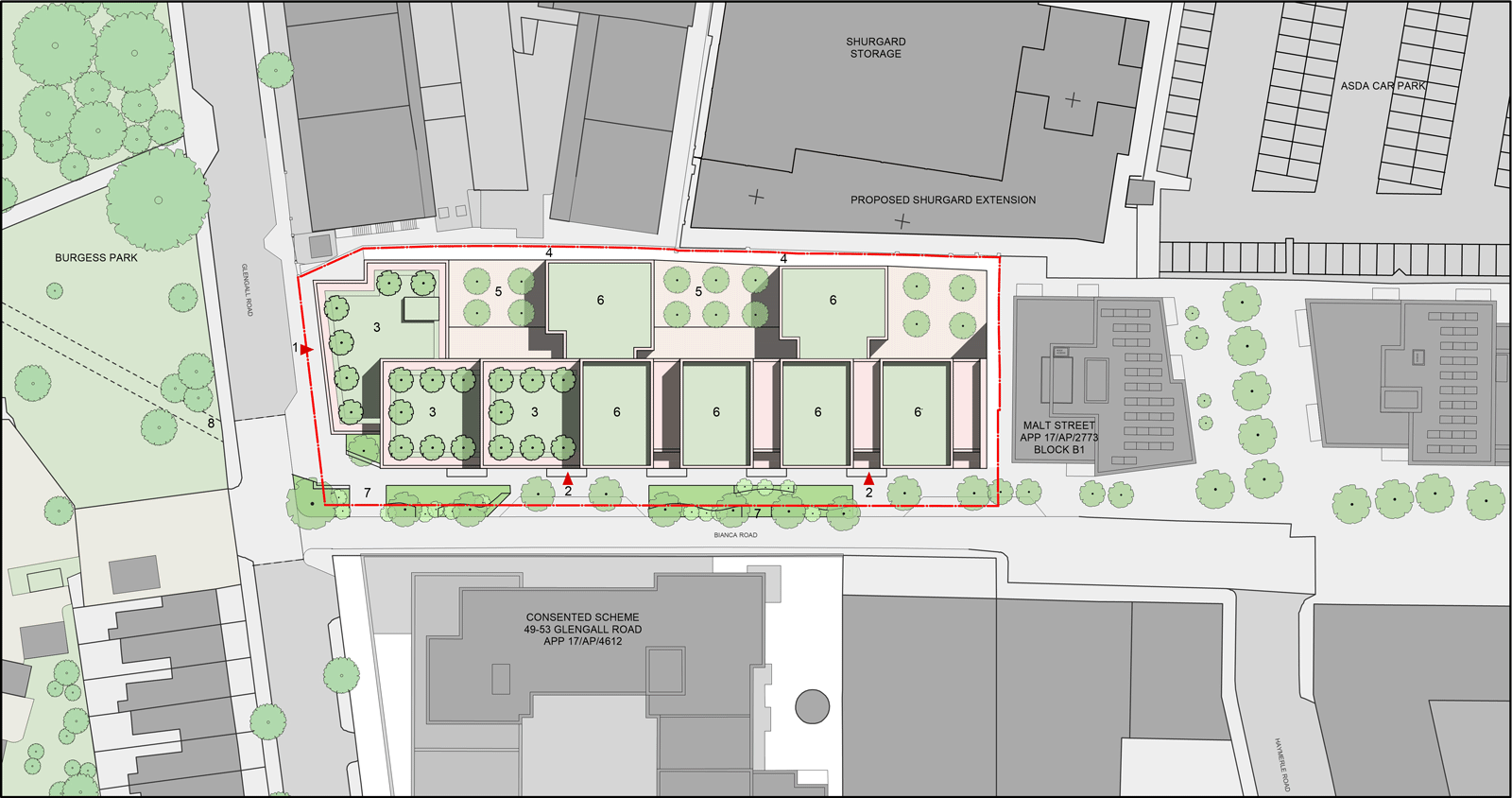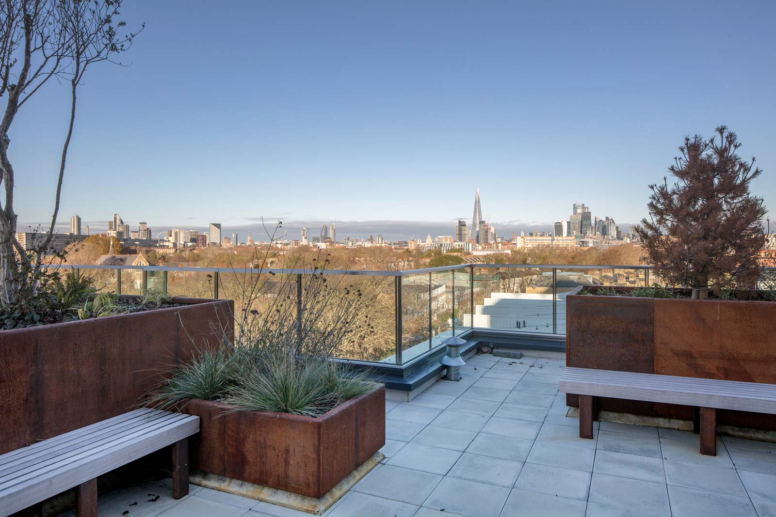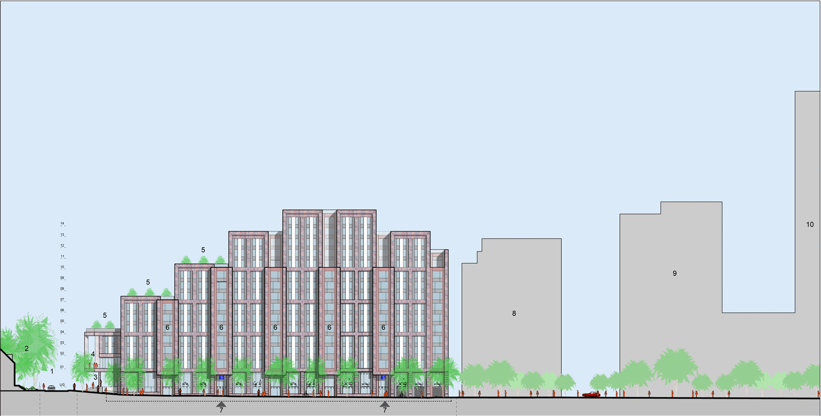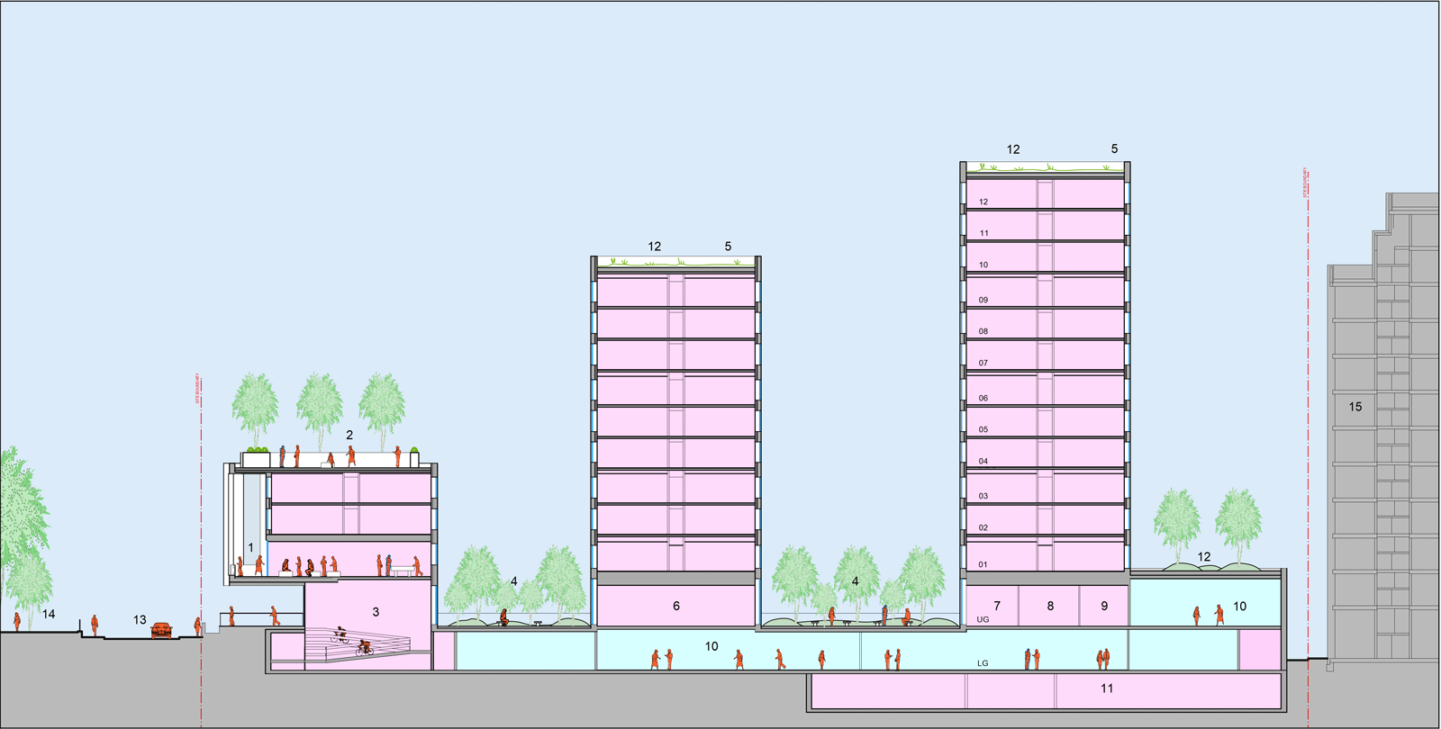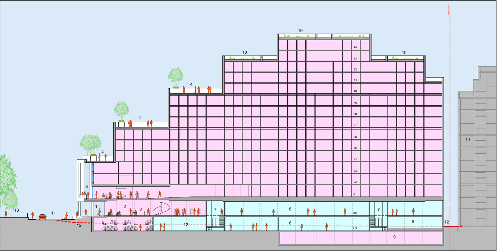The existing urban situation is formed from small scale 3-4 residential buildings beside Burgess Park rising to what will be fifty stories further to the east. This new building has to mediate these different scales which it does by means of a series of stepped terraces rising to fourteen stories.