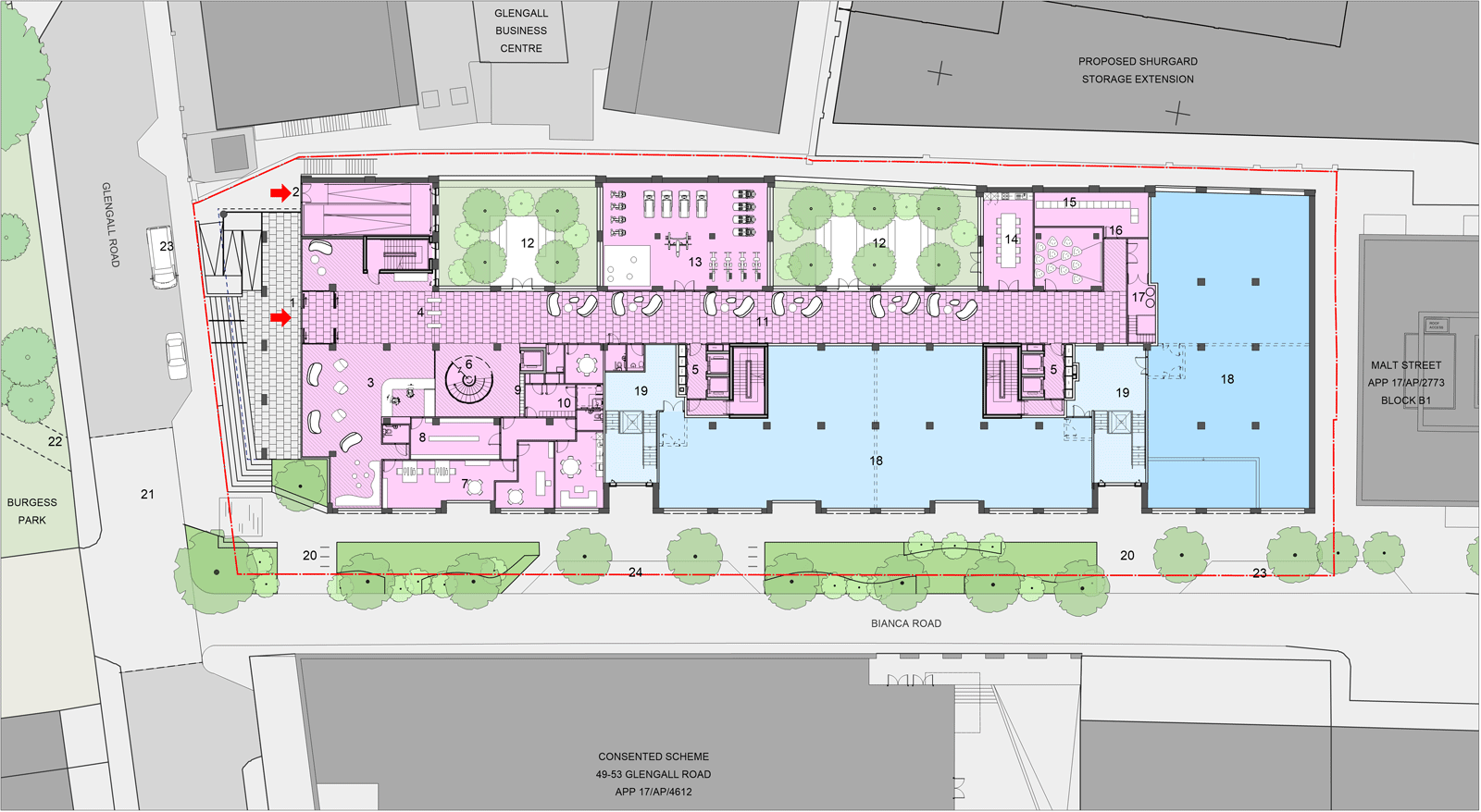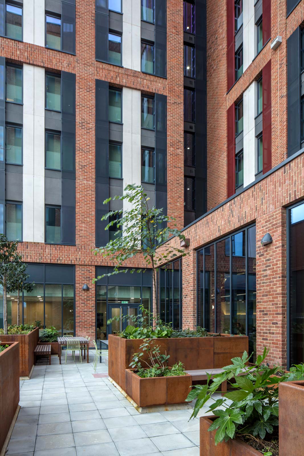 At ground level an internal street leads to a series of courtyards and lift cores leading to student rooms above.