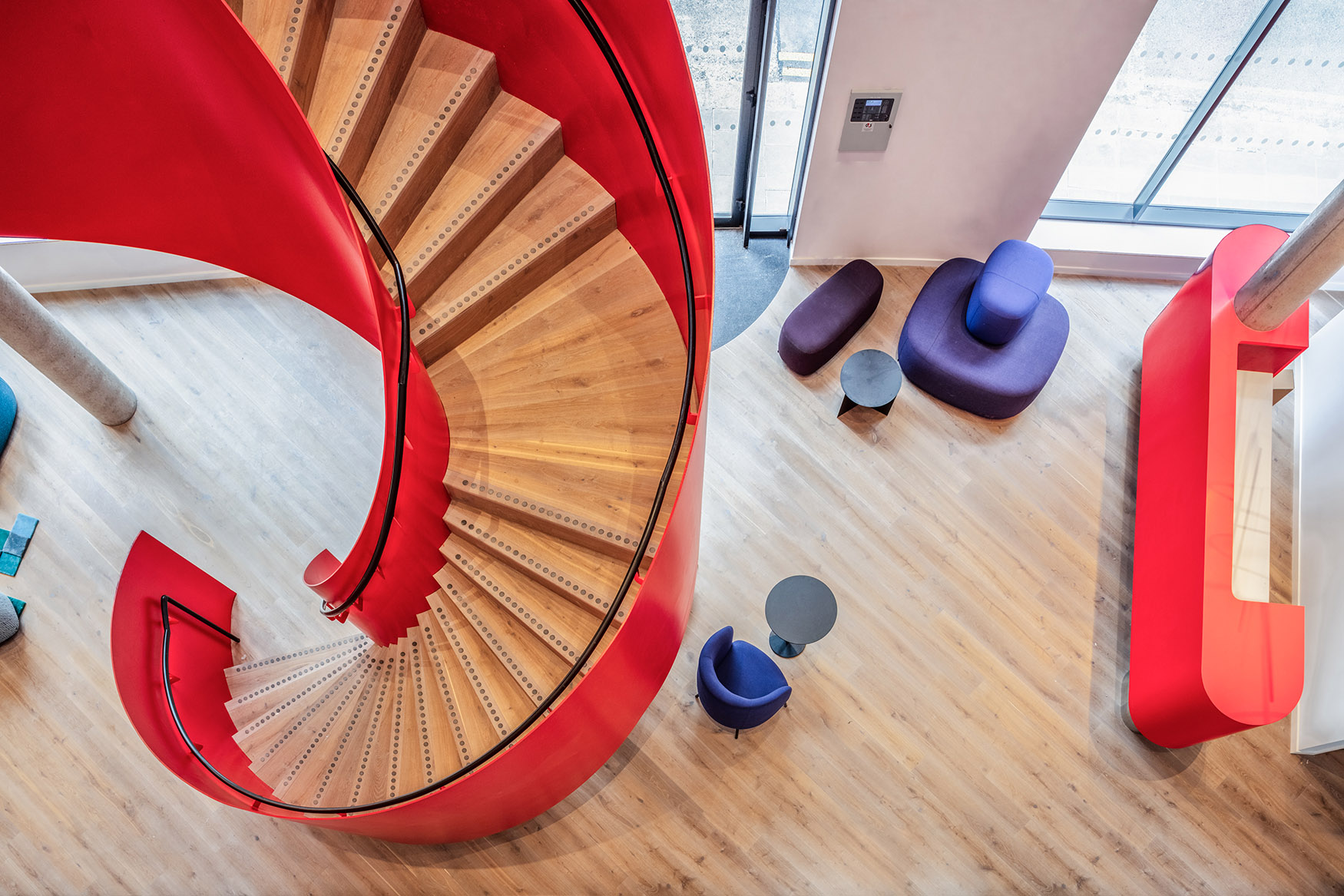 The student common room is at the courtyard podium level and is linked to the street level reception by spiral stair.
