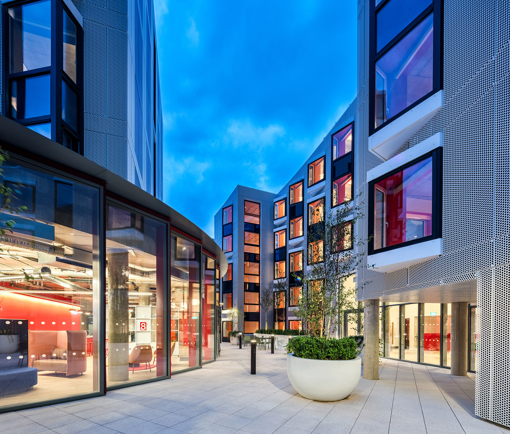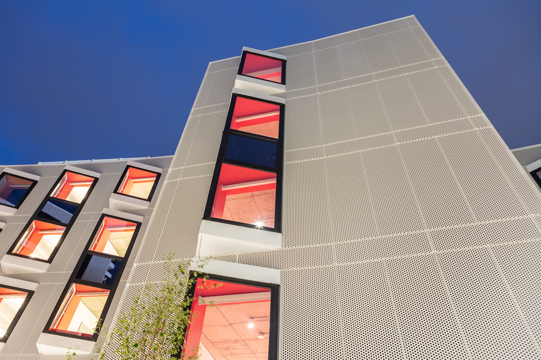 The new building is clad in brick on the street elevations and the inner courtyard elevations are formed in white perforated aluminium.