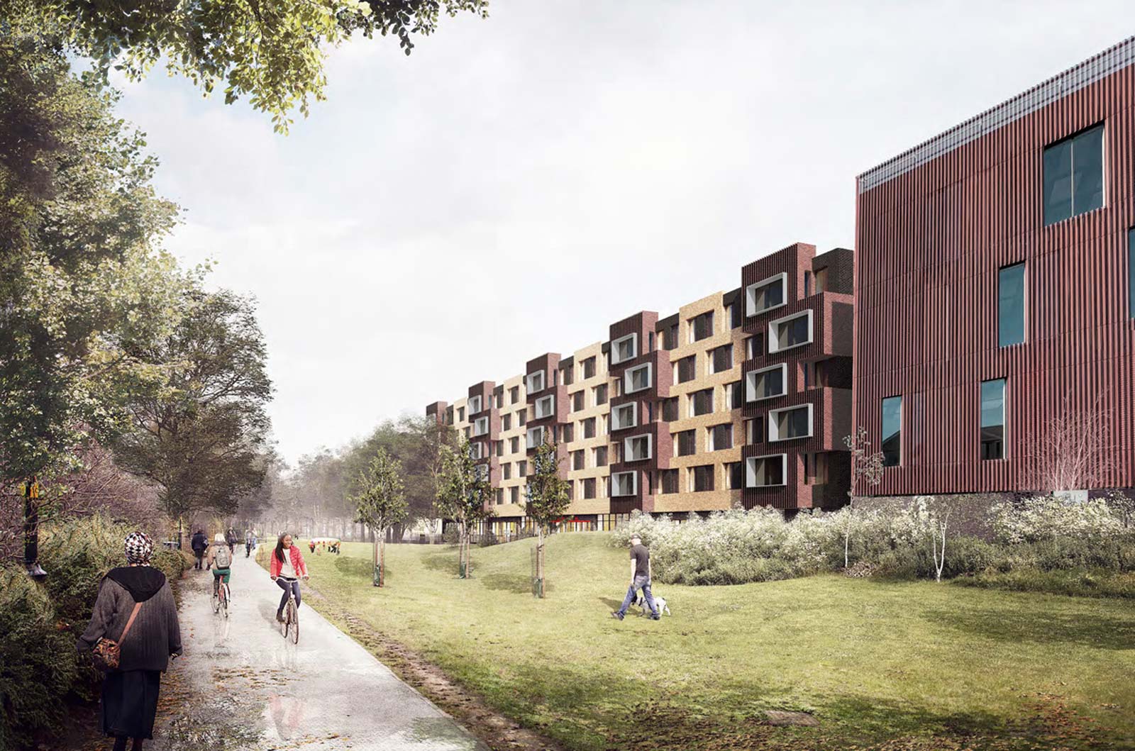 The building takes the form of a six storey volume to the park with pavilions within the courtyard to the rear. The kitchen/common rooms project out to the park and offset from floor to floor in similar fashion to the stacks of timber that were historically stored on the former Canal Wharf.